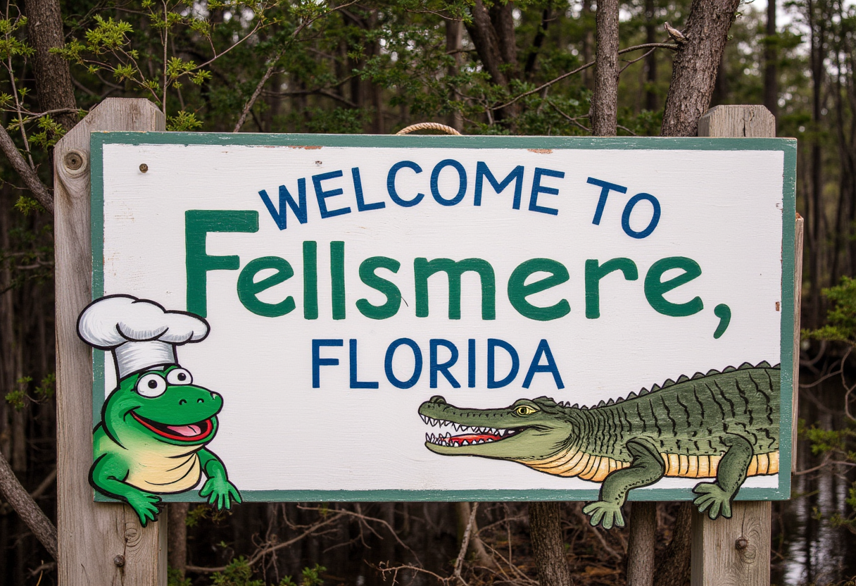 Fellsmere Welcome Sign with Frog & Gator: A rustic, hand-painted "Welcome to Fellsmere, Florida" sign. Prominently featured on the sign are whimsical illustrations of a smiling frog and a friendly alligator.