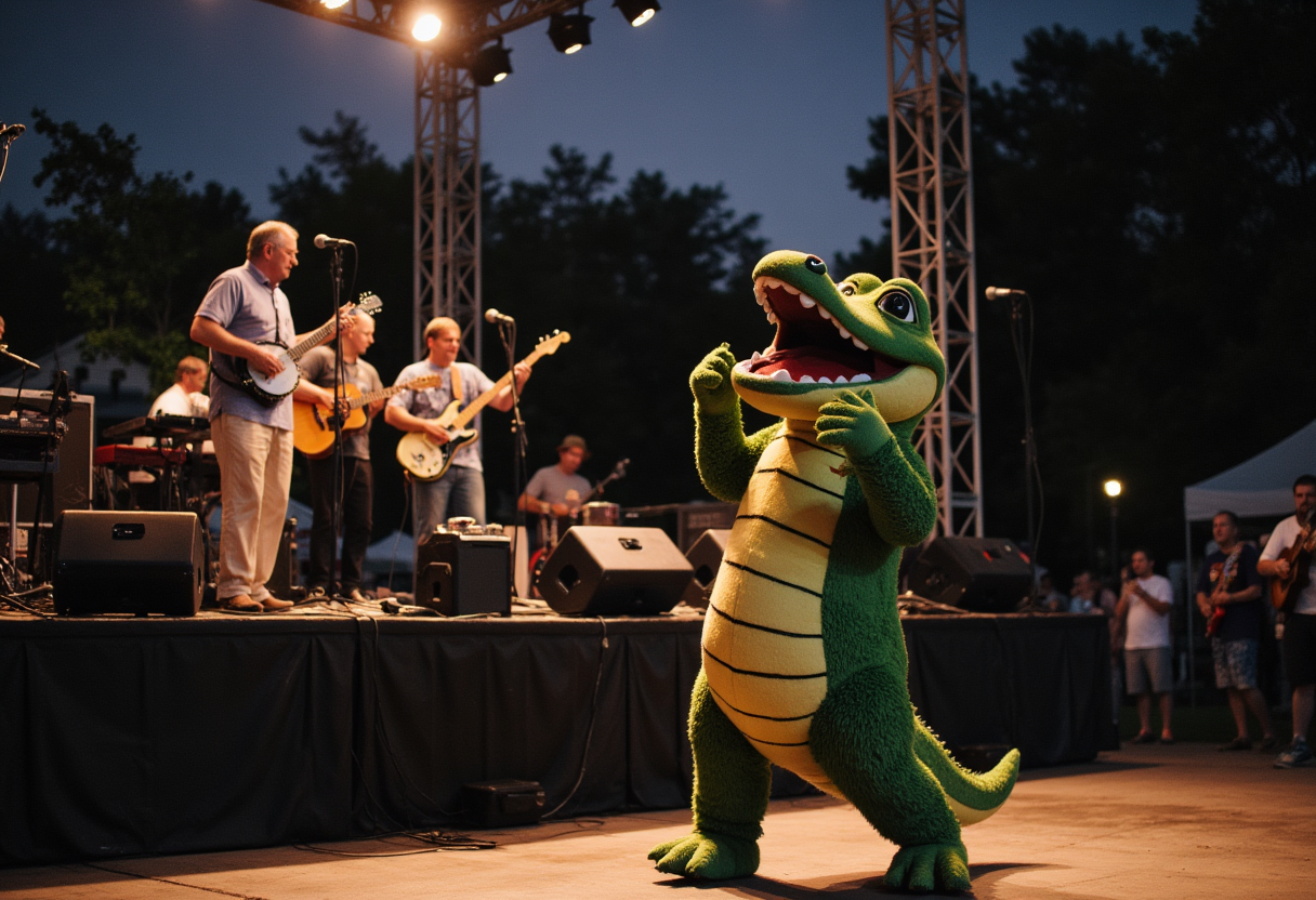 Gator Mascot Dancing with Bluegrass Band: A whimsical scene where a human-sized alligator mascot, looking jovial and animated, is "dancing"near a stage. On the stage, a lively bluegrass band is playing, with instruments like a banjo, fiddle, and guitar visible. The scene is set under festival lights at dusk or night.