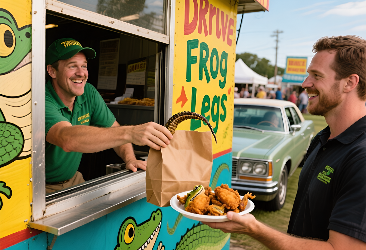 Drive-Thru Frog Legs: A vibrant, slightly humorous shot of a festival drive-thru. A car (perhaps an older model, adding to the charm) is at a window, and a friendly vendor is handing a brown paper bag or plate filled with fried frog legs and gator tail to the driver.