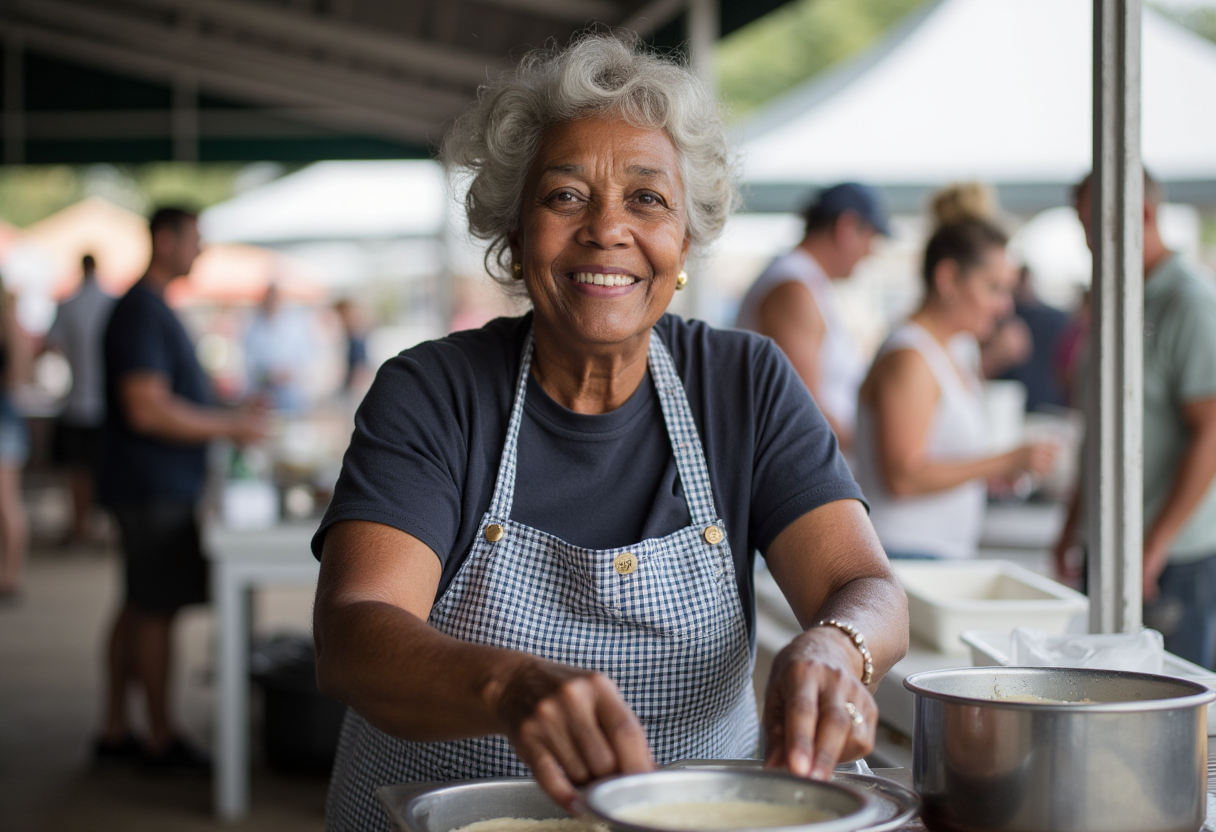 Miss Loretta at Hushpuppy Station: A candid portrait of Miss Loretta, a kind, older woman with a beaming smile and a twinkle in her eye, standing at a bustling hushpuppy station.