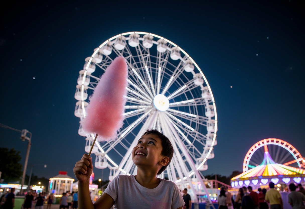 Ferris Wheel at Night with Cotton Candy: A stunning shot of a brightly lit Ferris wheel spinning against a dark, star-dusted Florida night sky. In the foreground, a child, their face sticky and happy, is holding a massive stick of vibrant pink or blue cotton candy,