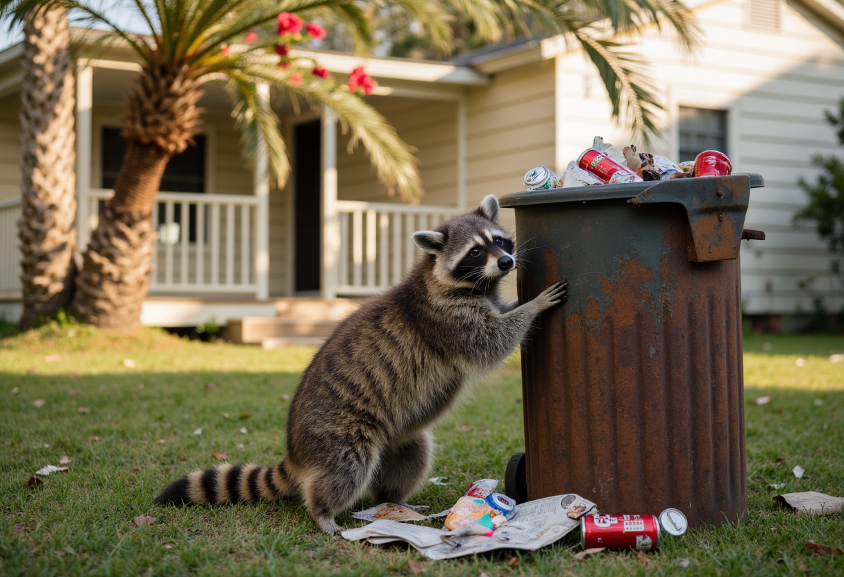scene of a raccoon in a Florida suburban backyard, rummaging through a rusty, overflowing garbage can with a bemused expression, as if it's uncovering a treasure trove of secrets.