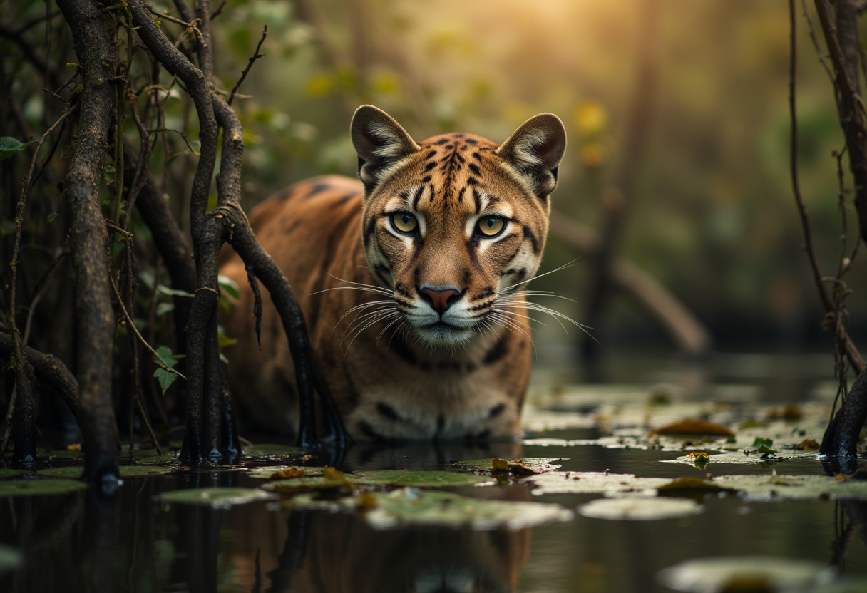 portrait of a majestic Florida Panther, partially concealed amidst the lush, emerald-green foliage of a misty wetland environment,