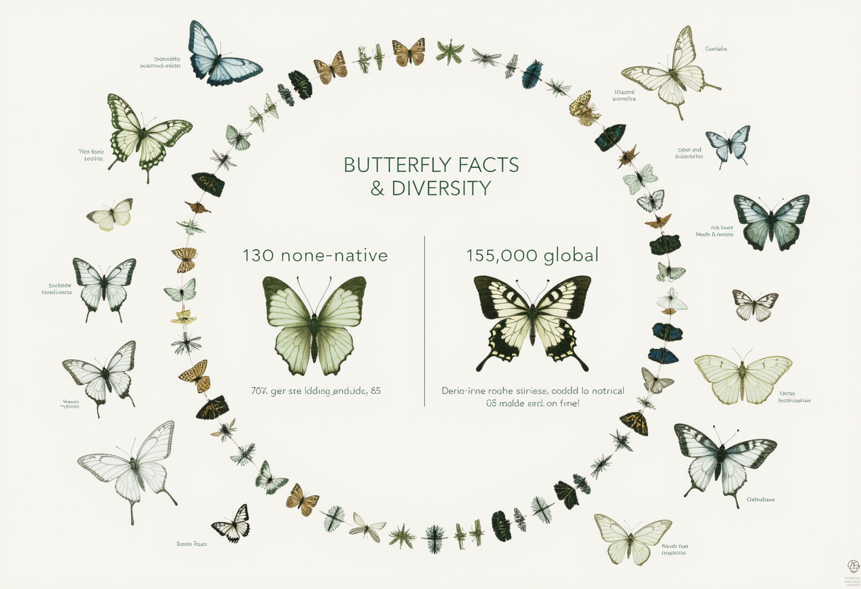 Key numbers at a glance: approximately 170 native butterfly species recorded in Florida, plus roughly 30 non-native or vagrant species; globally the order Lepidoptera includes an estimated 150,000 named species (the majority are moths); North America contains about 765 recognized butterfly species; and when butterflies and moths are combined, Florida’s Lepidoptera list approaches 3,000 species. (Replace with specific citations in the rewrite: Florida Museum checklist, Butterflies and Moths of North America, and NABA.)