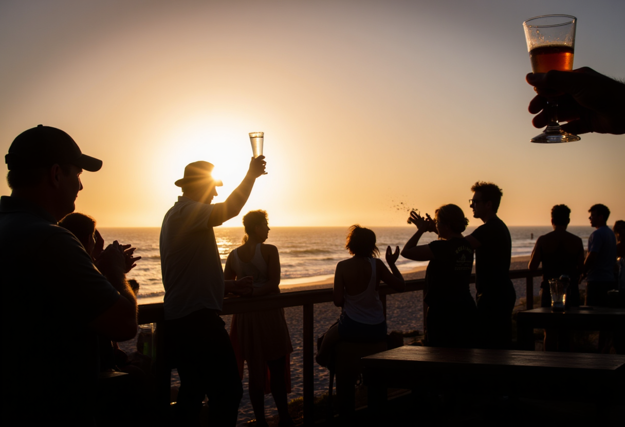Sunset at The Mucky Duck: A dynamic scene at The Mucky Duck. People are gathered on the beach or an outdoor patio, holding sundowner drinks, their faces turned towards the brilliant sunset over the Gulf. Silhouettes of individuals clapping or cheering as the last sliver of sun dips below the horizon create a communal, celebratory atmosphere.