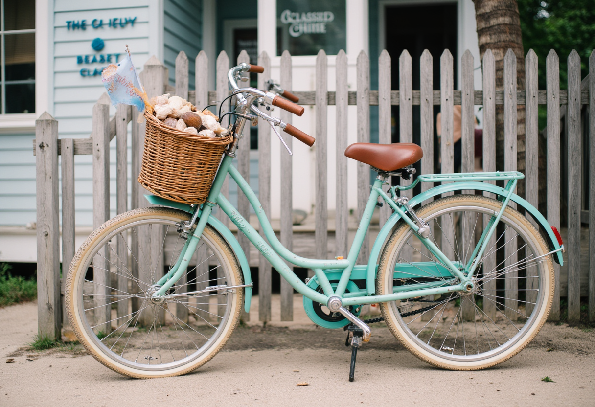 Beach Cruiser with Shell Basket: A classic beach cruiser bicycle, perhaps powder blue or mint green, casually leaning against a fence or a palm tree. A woven basket on the handlebars is filled with a few carefully placed seashells