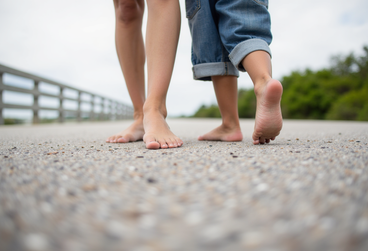 Barefoot on Causeway: A close-up, low-angle shot of bare feet (perhaps a mix of adult and child feet) stepping onto the Sanibel Causeway.