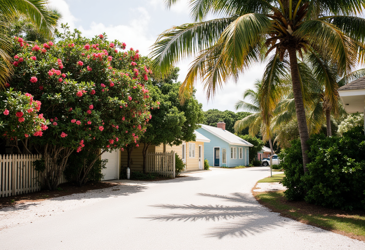 Pastel Cottages & Palm Trees: A picturesque street scene on Captiva Island. Charming, pastel-colored cottages (yellow, light blue, pink) are nestled behind a vibrant curtain of swaying palm trees and blooming hibiscus.