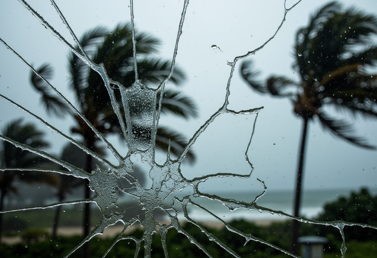 A close-up, high-contrast shot of a shattered window, with rain-lashed panes glistening like a thousand tiny diamonds as heavy, gray rain pours down in sheets, creating a mesmerizing dance of water droplets that streak and merge on the glass.