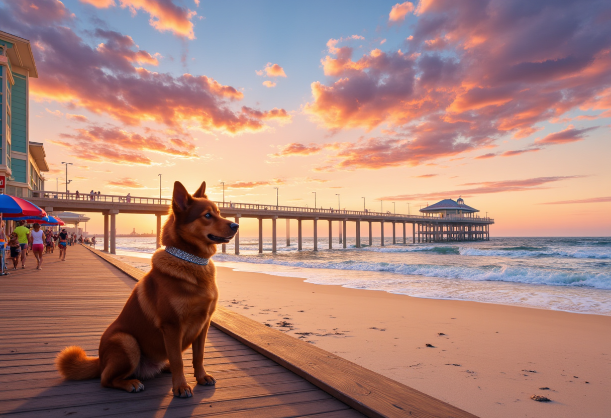 Brownie, a charismatic brown dog with a fluffy coat and a sparkling collar, standing proudly in the heart of Daytona Beach, Florida, at sunset.