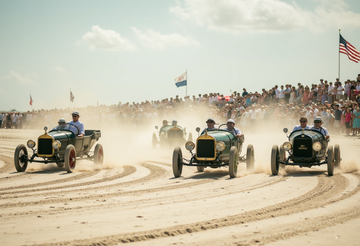By the 1920s, the shoreline had become famous for land-speed runs, a spectacle of roaring engines, flying sand, and large crowds that helped cement Daytona’s reputation as a center of speed and innovation.