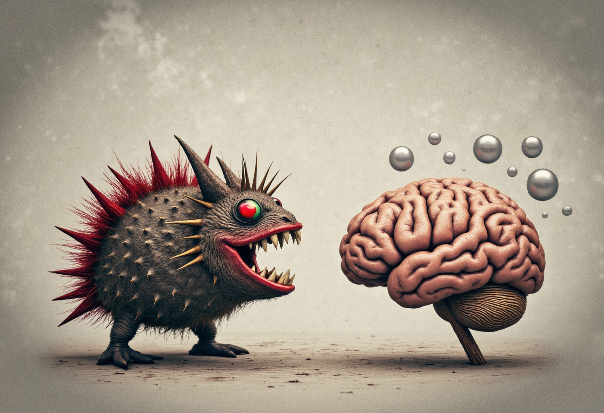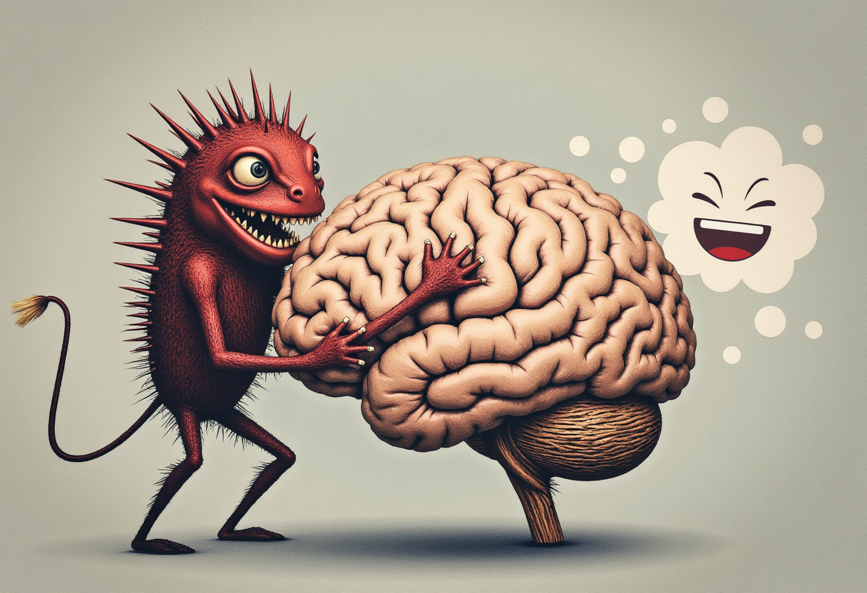 Brain's Fight Club): An artistic, metaphorical representation of the brain. On one side, a "stress" monster (perhaps spiky, red, or dark) is being playfully fended off or punched by a "laughter"