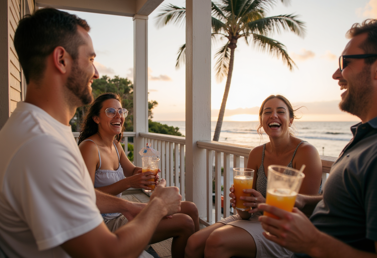 group of people is sitting on a porch or beach, laughing heartily while holding refreshing Florida drinks (iced tea, orange juice, or a cocktail with a tiny umbrella).
