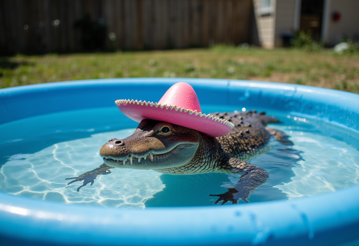 A humorous and slightly surreal image depicting an unexpected contradiction. For example, a majestic alligator wearing a tiny, perfectly fitted flamingo pink sombrero, calmly floating in a sparkling, bright blue kiddie pool in a suburban Florida backyard.