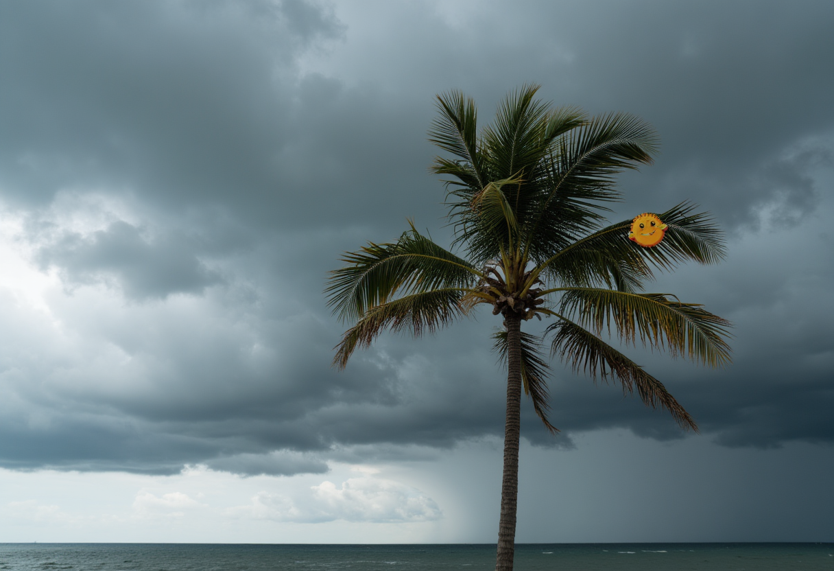 a single, strong palm tree standing firm against a receding, dark hurricane cloud. On one of the palm fronds, a small, vibrant, and slightly mischievous cartoon 'smile' or 'wink' is subtly incorporated
