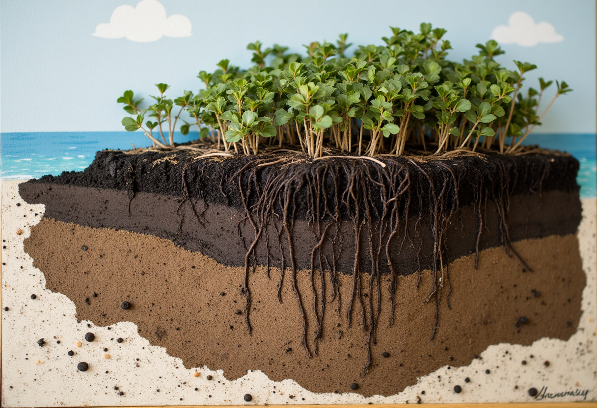 Carbon Storage - Soil Profile: An illustrative cross-section of mangrove soil, perhaps in a scientific-looking graphic or a carefully constructed diorama.
