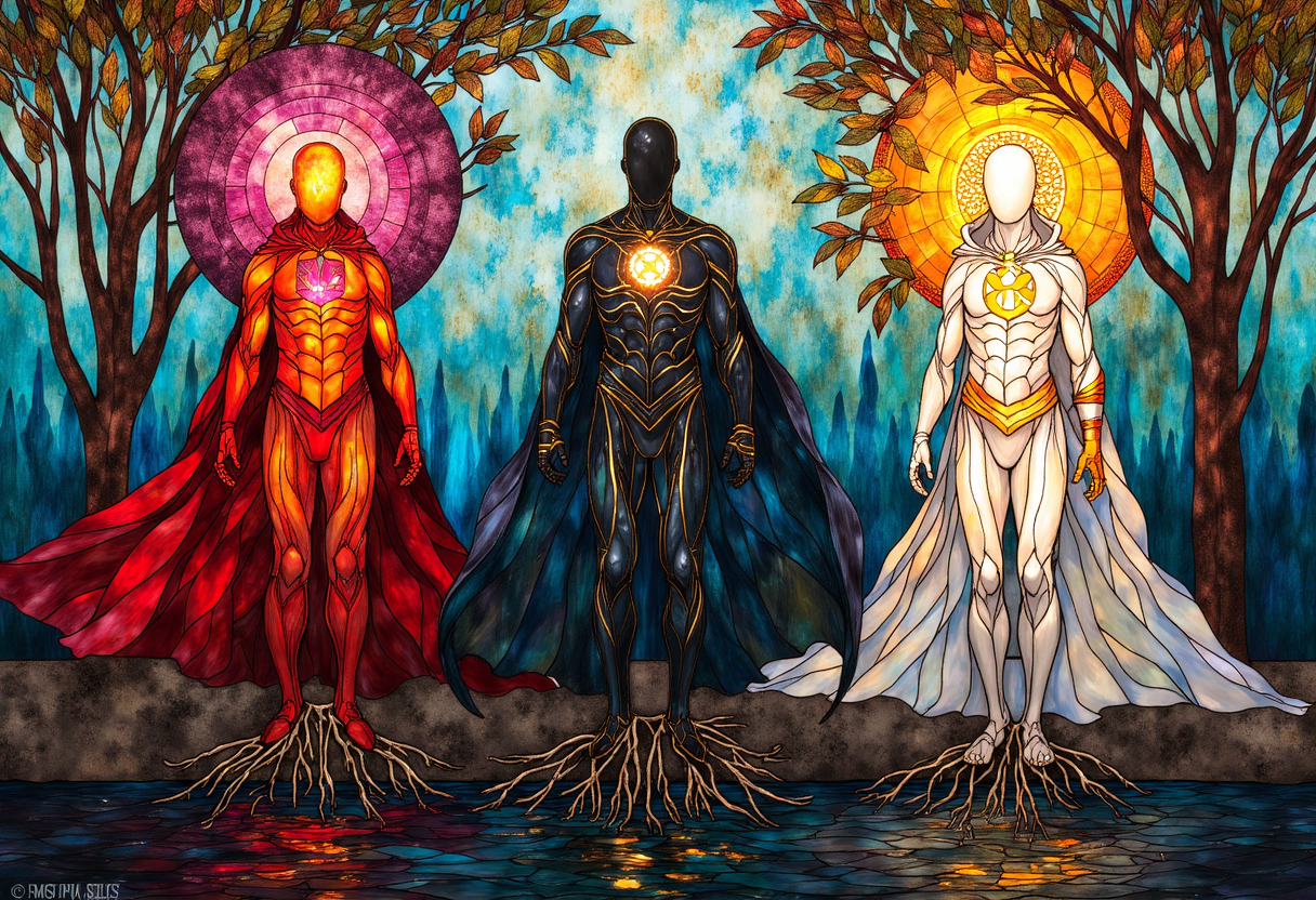 Mangrove Superheroes (Artistic Concept): An artistic, slightly abstract depiction of the three mangrove species – Red, Black, and White – personified as superheroes