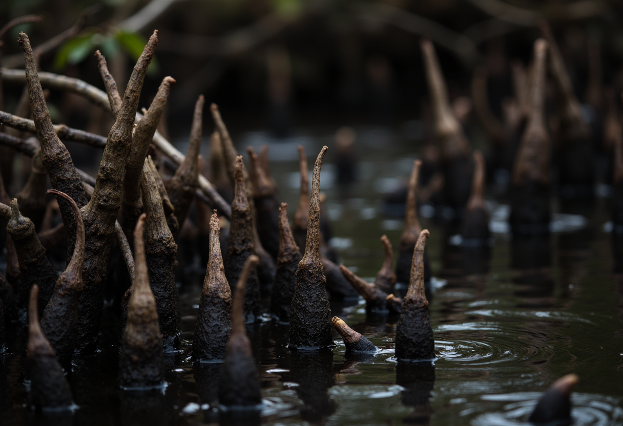 Black Mangrove - Pneumatophores: A scene focusing on the unique "snorkel-like" pneumatophores of Black Mangroves, sticking up from dark, muddy soil.