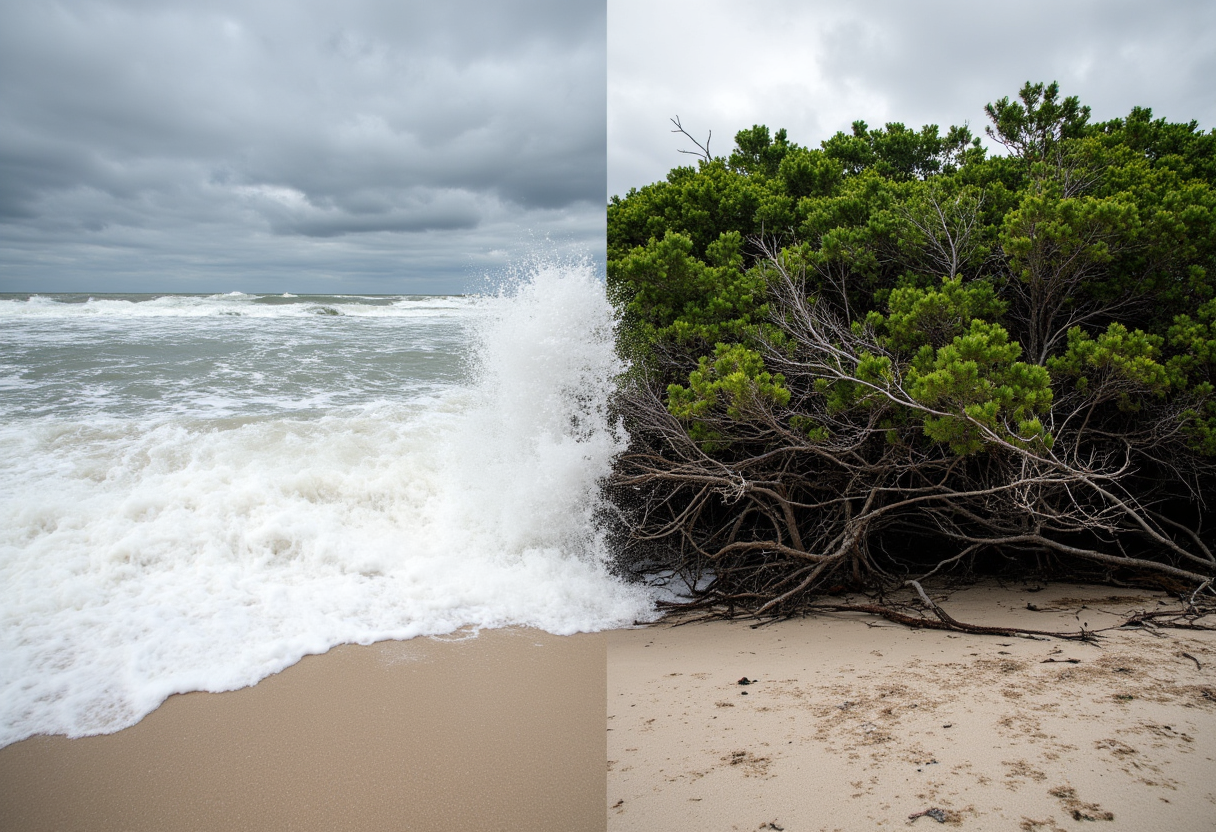 Storm Surge Absorption - Before & After: A split image. One side shows a powerful ocean wave crashing unimpeded onto a bare coastline. The other side shows the same wave's energy significantly dampened and diffused as it encounters a dense, healthy wall of mangrove forest.