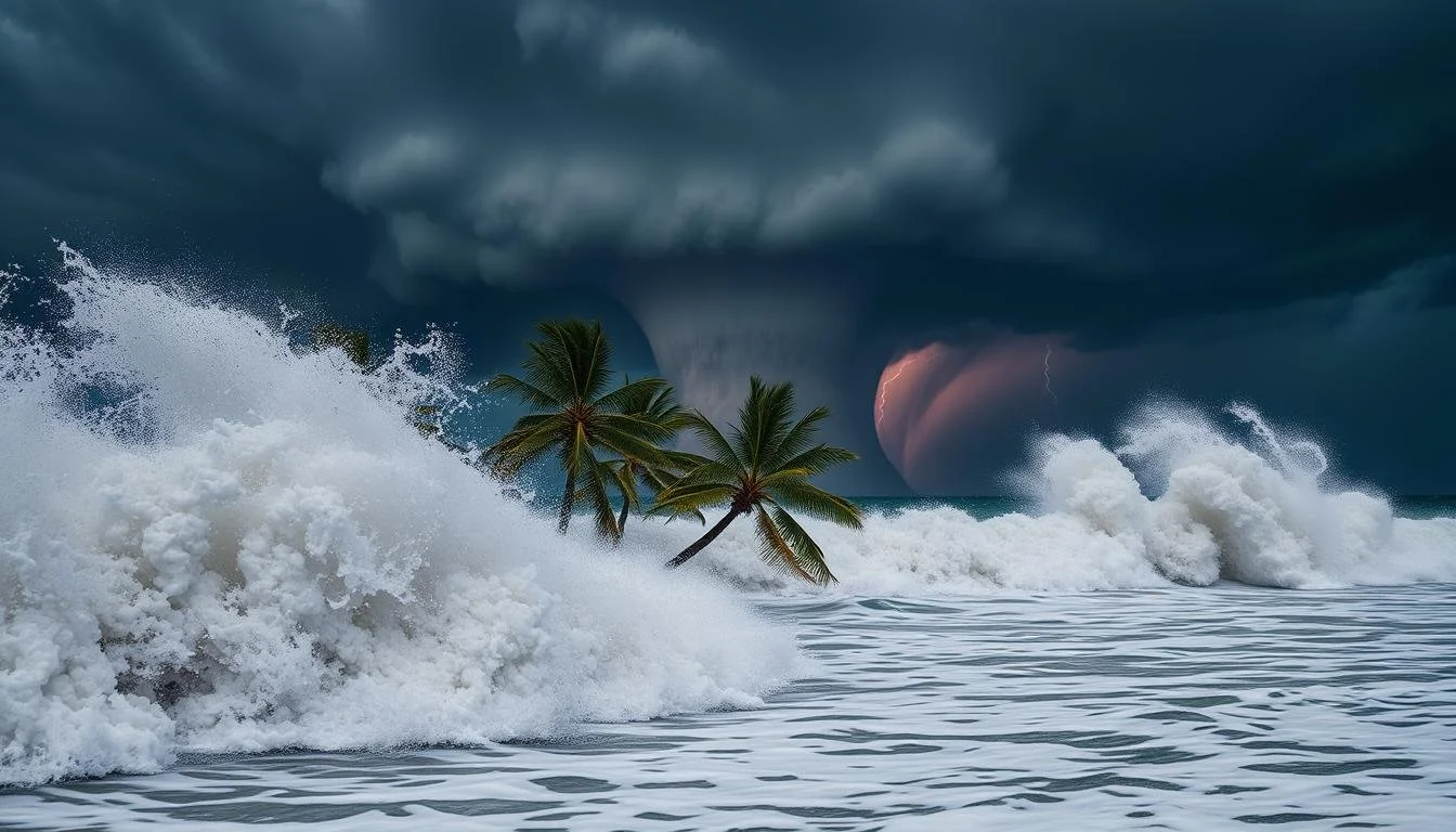 "A dramatic digital illustration depicting a sunny, idyllic Florida coastline scene quickly transforming into a powerful storm.