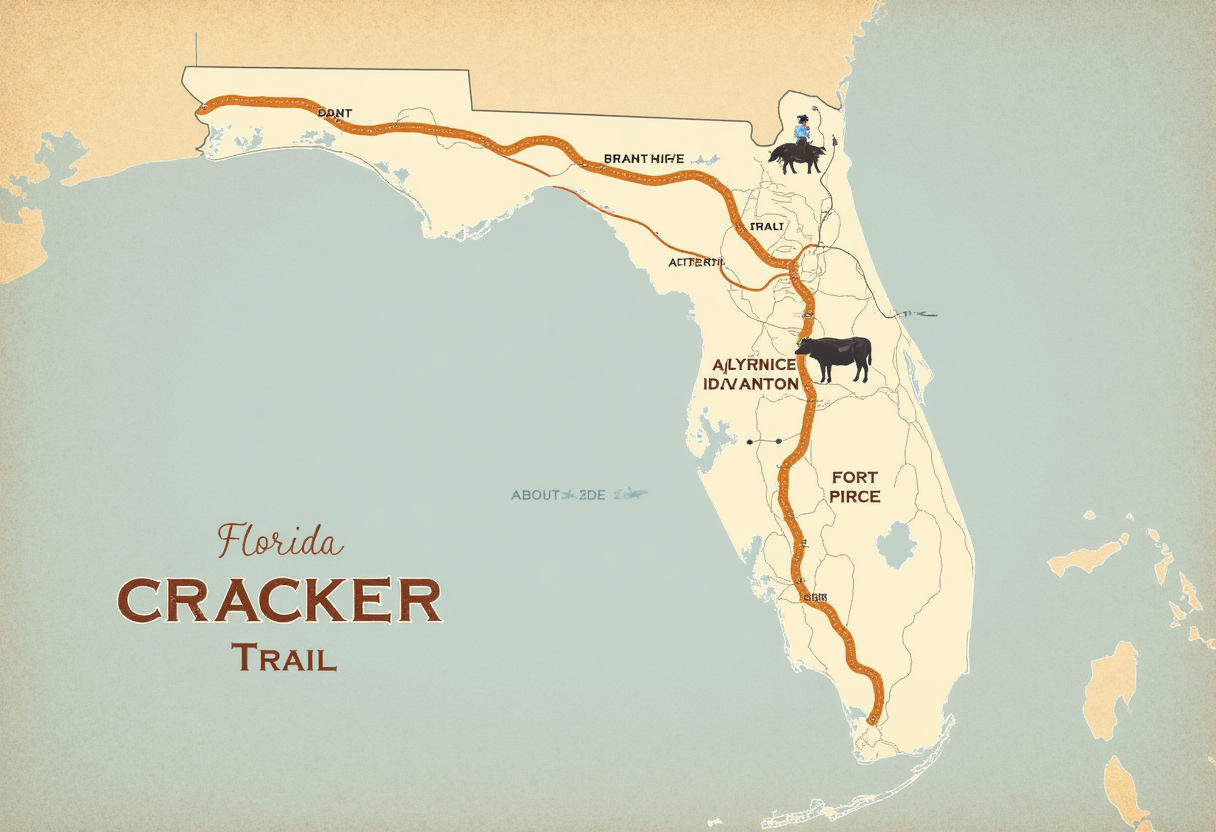Florida Cracker Trail — route & miles: In the mid- to late-19th century, ranchers needed a reliable overland route to move cattle from Gulf-side grazing lands to Atlantic shipping points. The historic Cracker Trail ran roughly 120–140 miles across central Florida, generally linking the Bradenton area on the Gulf to Fort Pierce on the Atlantic.
