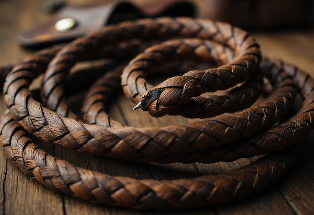 close-up image of a vintage, expertly crafted braided leather bullwhip, showcasing its intricate texture and craftsmanship, with a focus on the delicate dance of the braids and the worn, weathered leather.