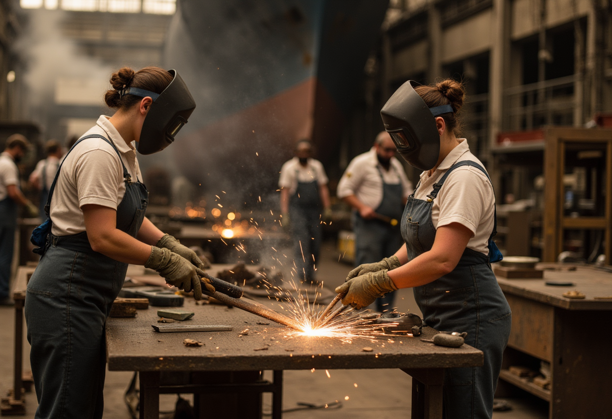 sepia-toned or historically styled image showing women in welding masks and coveralls, "Rosie Riveters," actively working in a bustling World War II shipyard.