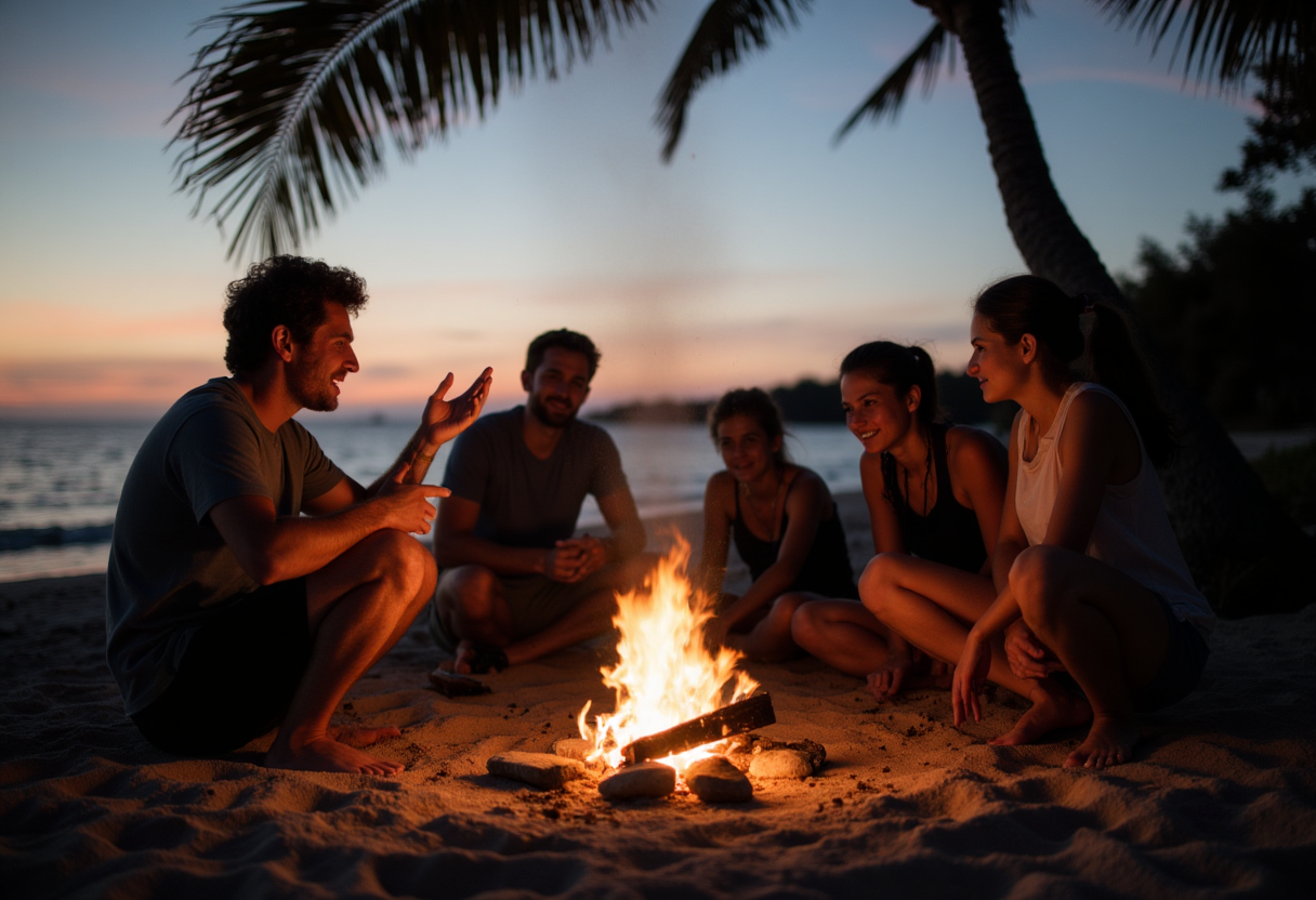 friends gathered around a crackling campfire on a Florida beach at sunset. Silhouetted palm trees frame the background, and the gentle waves of the ocean are visible. One person is actively telling a story, gesturing animatedly, while the others are leaning in, captivated, their faces lit by the firelight, emphasizing social bonding and timeless links.