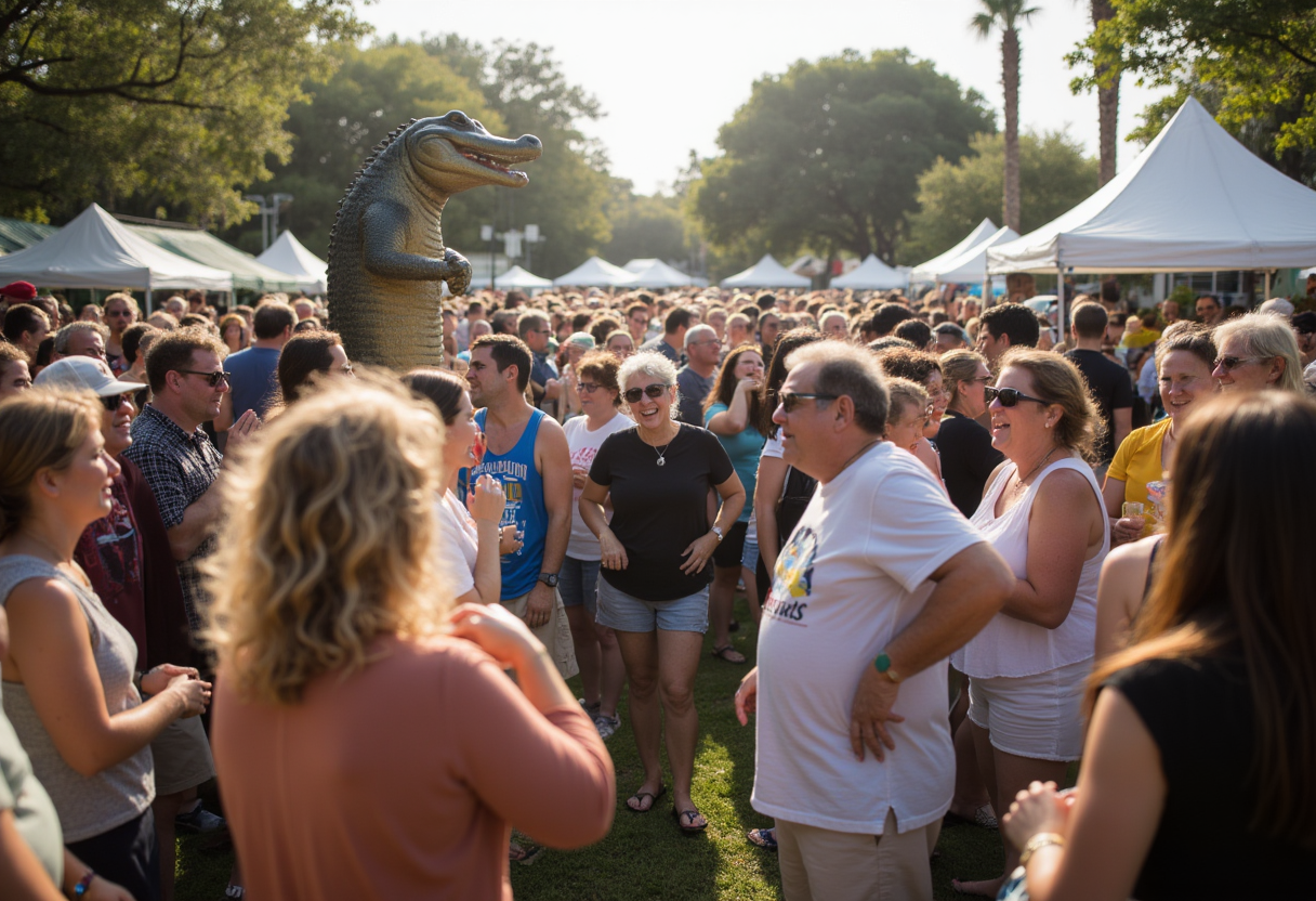 A bustling, joyful scene encapsulating the essence of Florida storytelling. A diverse crowd of Floridians (all ages, backgrounds) are gathered in a lively outdoor setting like a community festival
