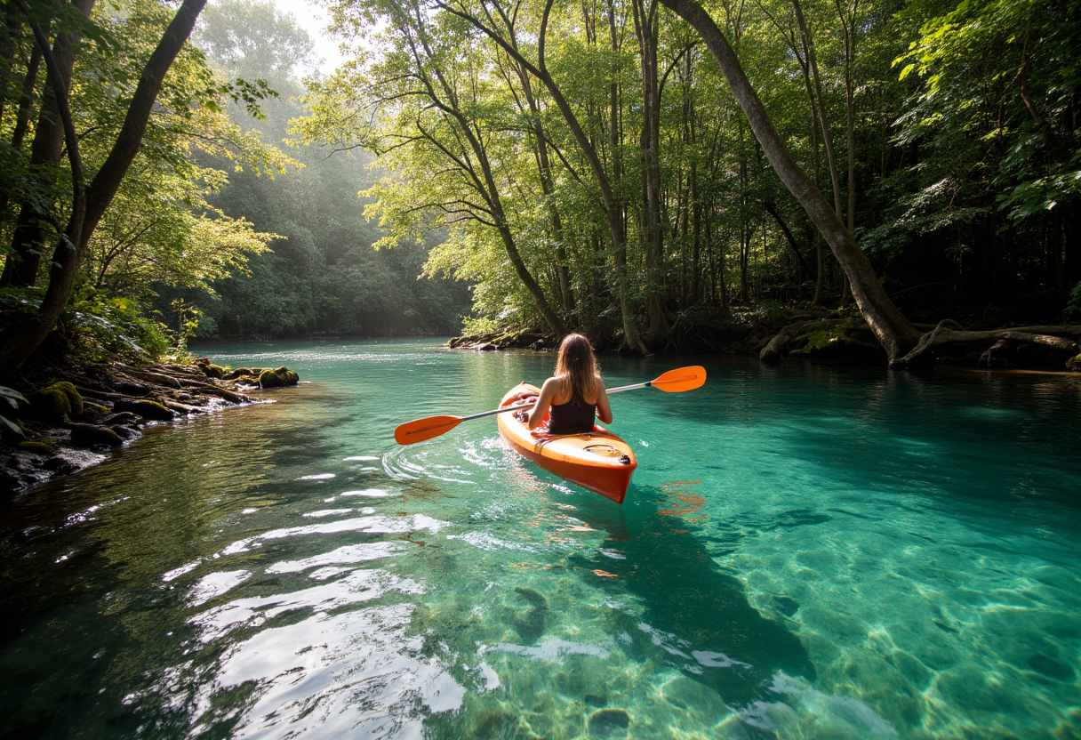 Juniper Springs - Paddle Adventure: A vibrant shot of someone kayaking or canoeing down the clear, emerald-green waters of Juniper Run