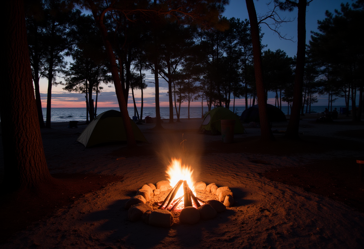 Anastasia State Park - Campfire & Beach: A warm, inviting campfire scene at dusk within Anastasia State Park.
