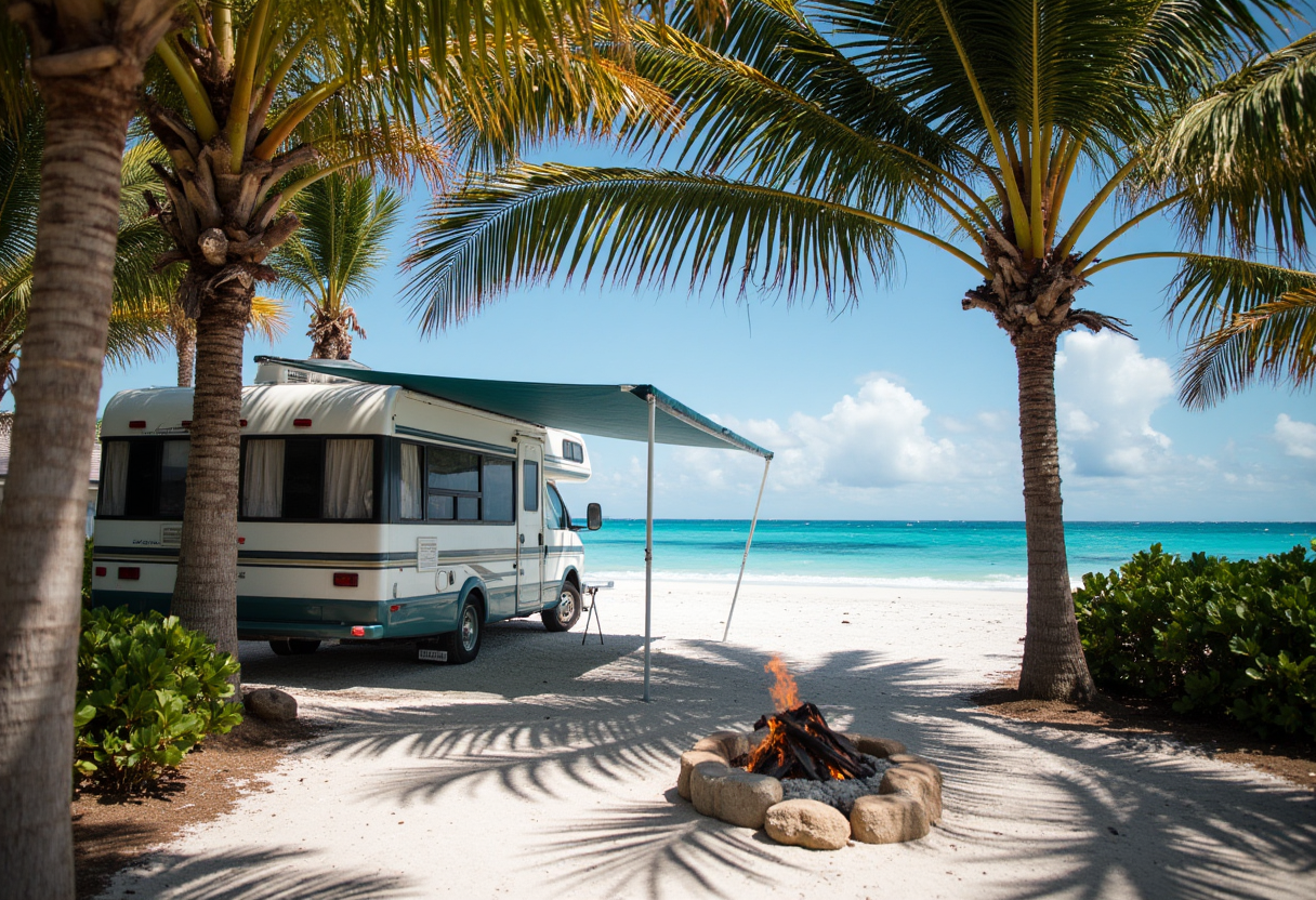 Paradise Campsite: A cozy RV campsite nestled under palm trees, overlooking a pristine Florida beach with turquoise water