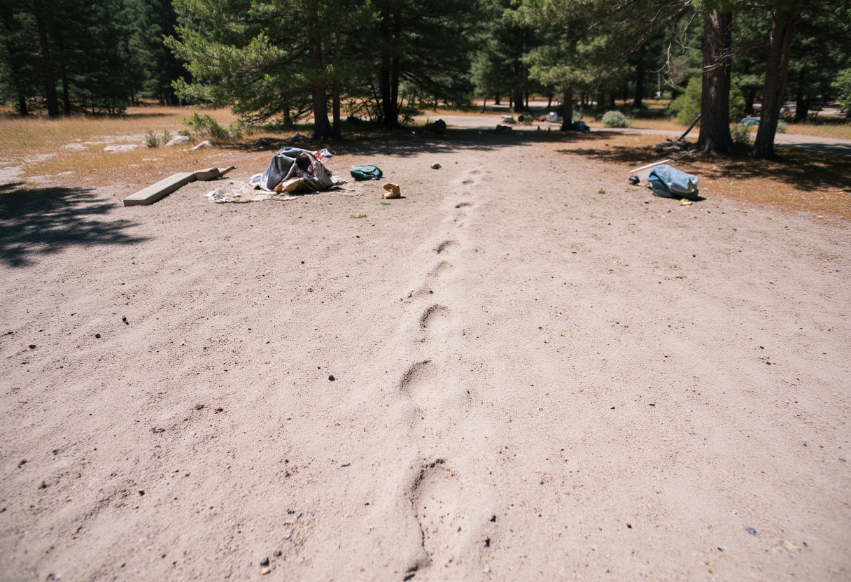 Leave No Trace / Clean Campsite: A pristine, empty campsite (perhaps after campers have left), showing no trace of garbage or disturbance, embodying the "Leave No Trace" principle.