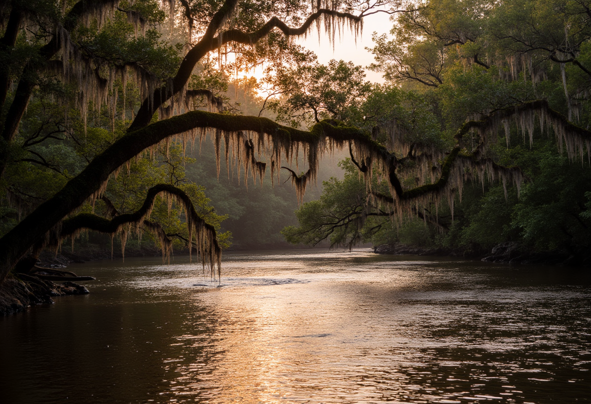 A serene shot of the Suwannee River at sunset, flowing peacefully past the park, with moss-draped oaks on its banks, providing a sense of the "mythic identity" Foster's lyrics gave the river.