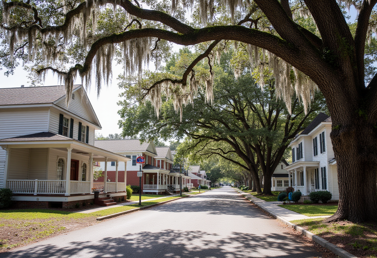A quiet street scene in the White Springs historic district, featuring well-preserved Victorian homes with wide porches, framed by ancient, moss-draped oak trees, evoking "quiet charm."