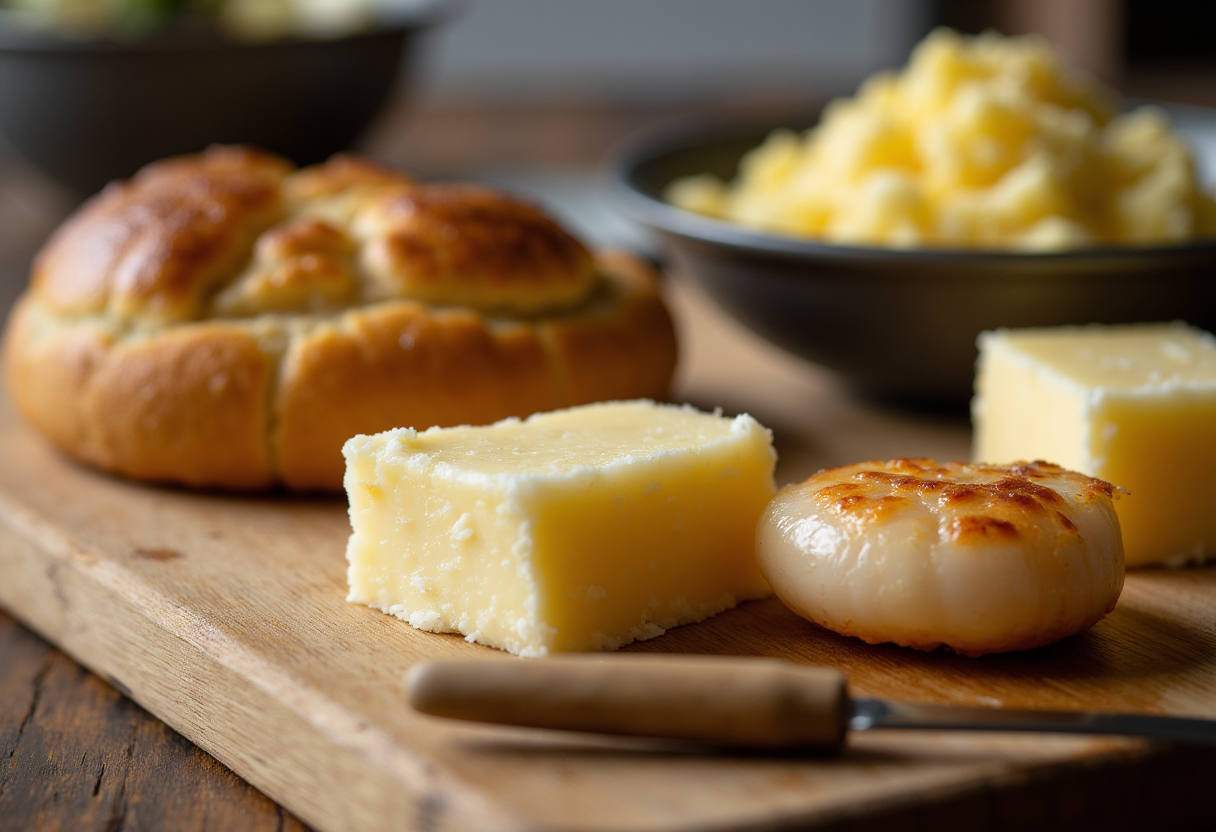 close-up, almost artistic, shot celebrating butter in its various glorious forms. This could include a perfectly seared scallop glistening with butter, a golden-brown, flaky pie crust, and a bowl of fluffy scrambled eggs, all framed by a beautiful, rich pat of butter on a wooden board.