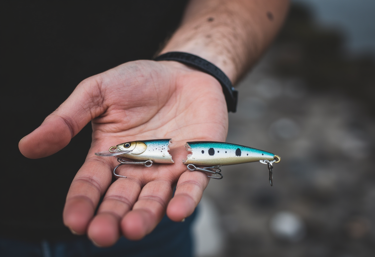"A custom-made, hand-painted fishing lure, snapped cleanly in half, with clear bite marks precisely where the hook should have been.
