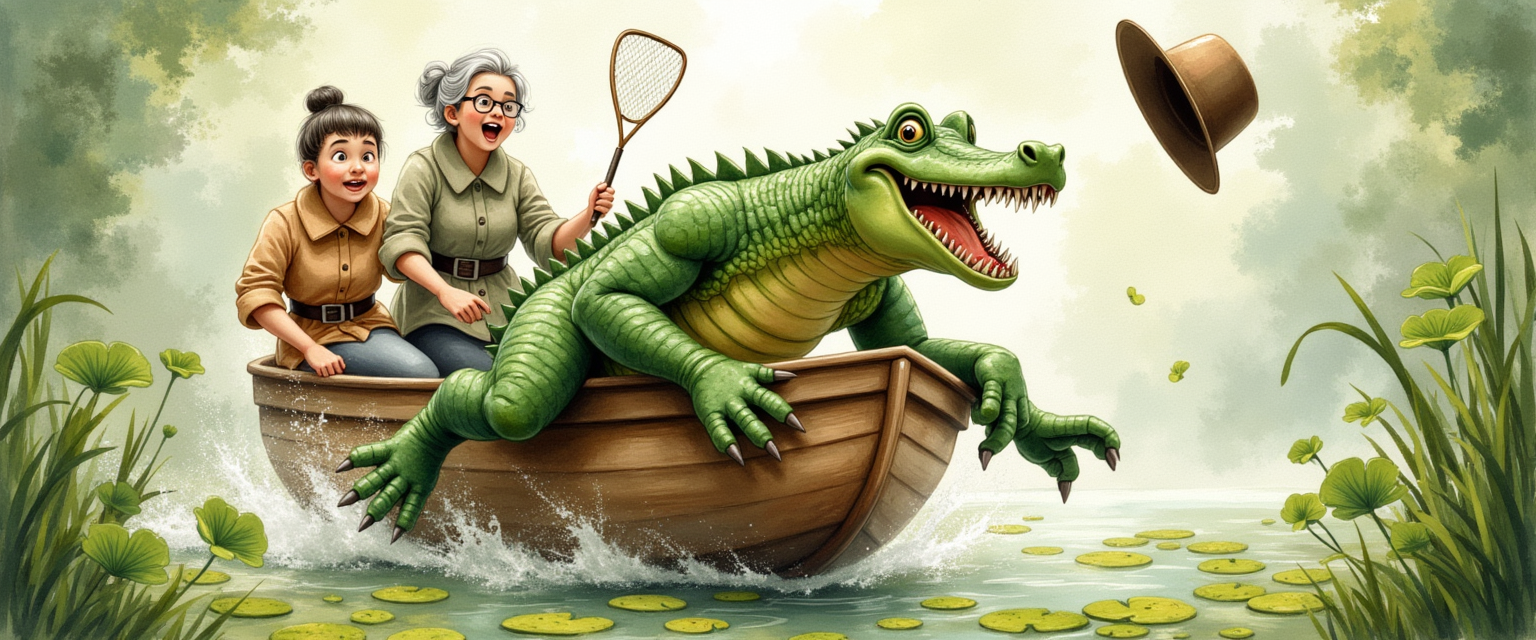 Croc resurfaced, sputtering, his hair plastered to his face like a drowned cat, a lily pad adorning his head like an accidental fascinator. "Just... demonstrating the water temperature!"