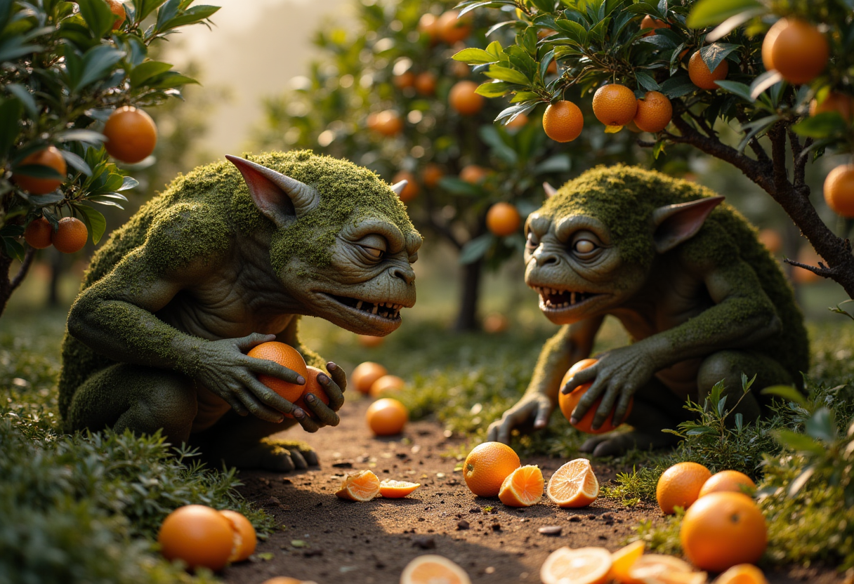 illustration "Orange Ogres"carefully tending to glowing orange trees in a citrus grove, while mischievous, slightly grungier "Grapefruit Goblins"