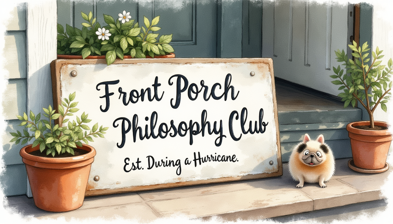 a whimsical decorative sign reads 'Front Porch Philosophy Club – Est. During a Hurricane,' painted in a playful script.