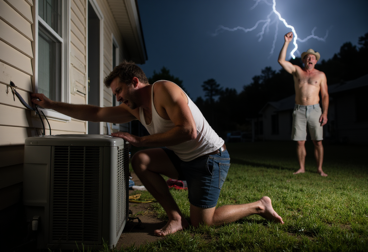 "A comical scene of a person trying to fix an AC unit during a lightning storm, barefoot, with a look of utter bewilderment or foolishness on their face