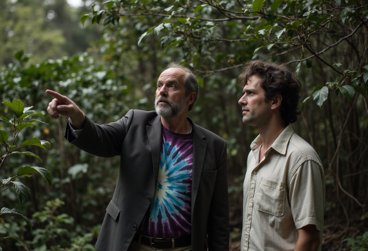 Startled, I looked up to find an old man perched like a gnarled sentinel among the fronds — a beard that could host a squirrel commune, overalls with no shirt, and a wide-brimmed straw hat. He introduced himself as Old Man Tiber.