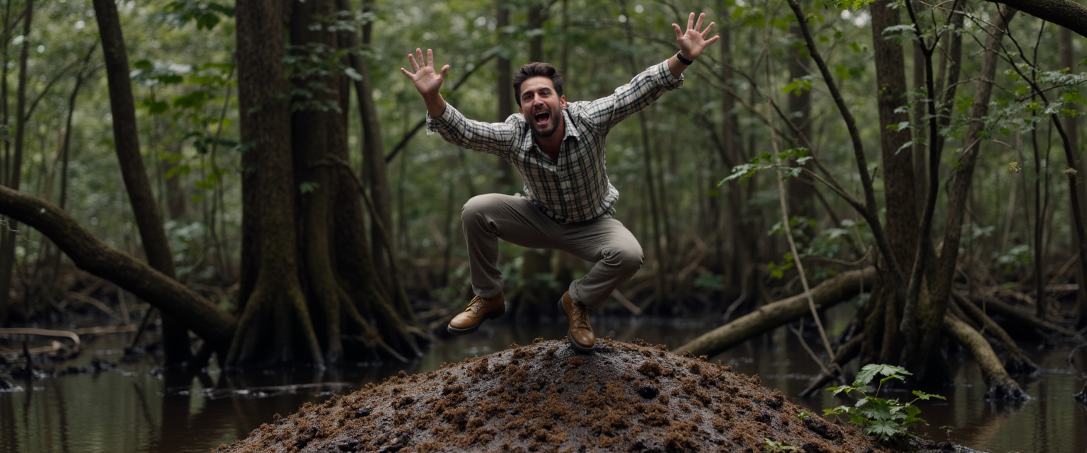 the protagonist mid-air, arms flailing, doing an 'involuntary interpretative dance' atop a mound of fire ants, having mistakenly identified a harmless garden snake as a deadly water moccasin.