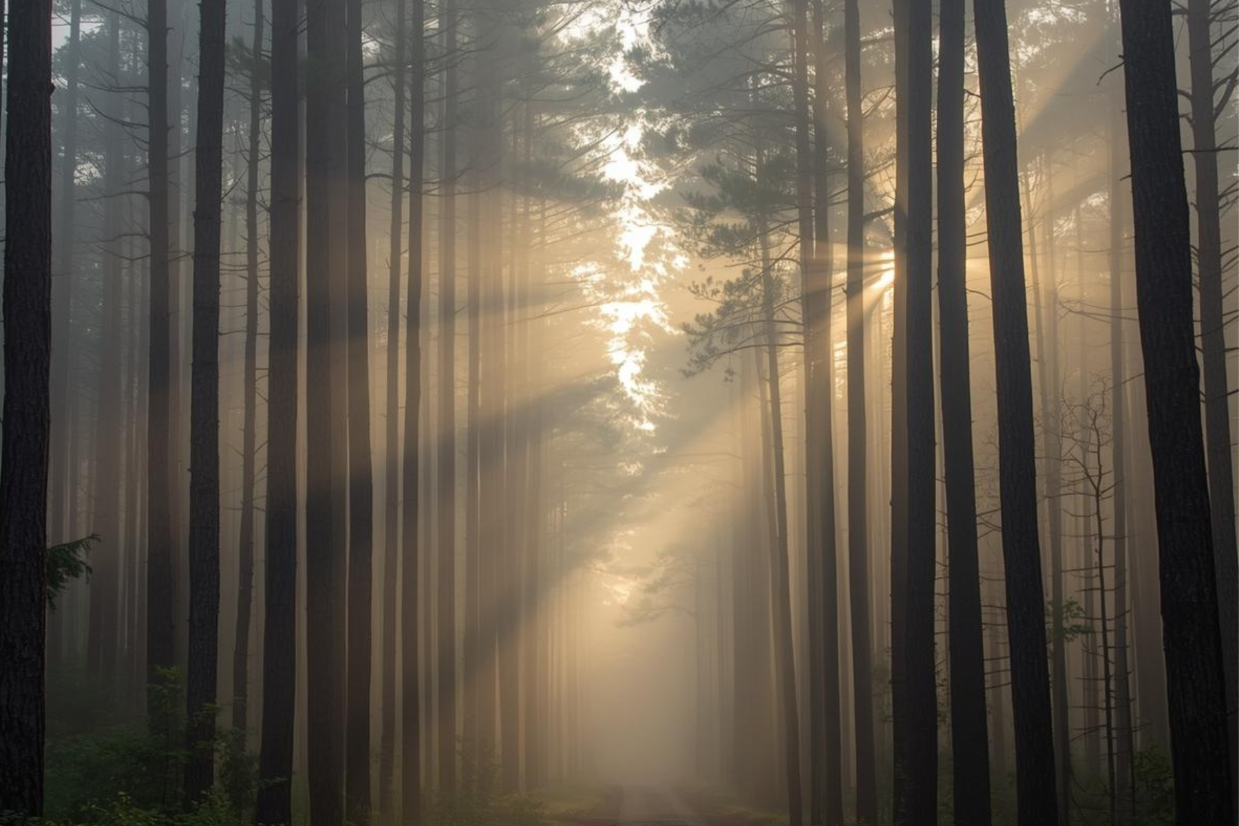 Tall trunks pulling the sky closer. Pine needles cushion each step. The forest leans inward just enough to feel protective, like a room built entirely of patience.