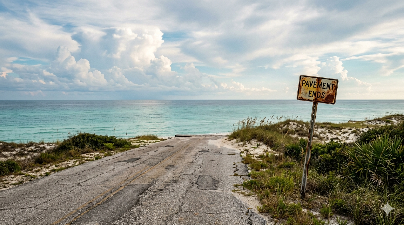 cracked asphalt road ending abruptly at the edge of a vast, calm turquoise ocean in the Florida Panhandle.