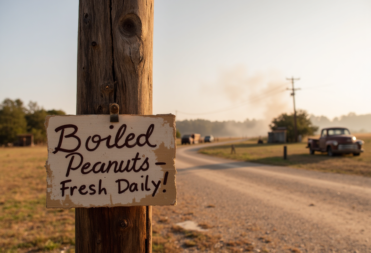a faded, hand-painted sign 'Boiled Peanuts - Fresh Daily!'
