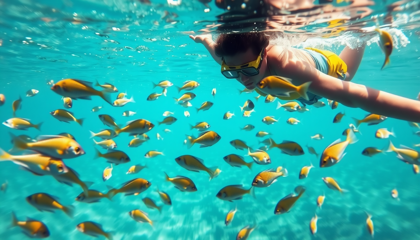 “Snorkeler above a spring vent in Florida, water so clear it looks invisible, fish swimming below”