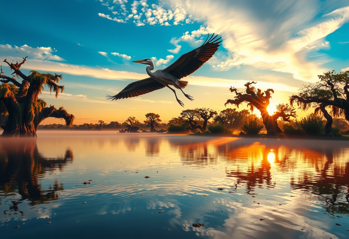 great blue heron in mid-flight, soaring above the misty, sun-dappled waters of a serene swamp