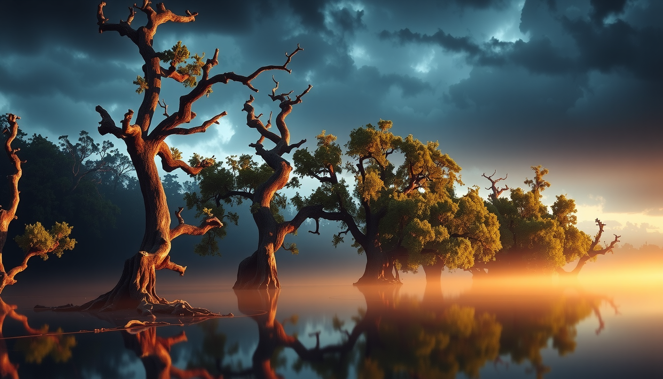 Looking up, the canopy is a chaotic masterpiece. Bromeliads cling to the bark like spiky green urchins, and Spanish moss hangs in ghostly curtains.