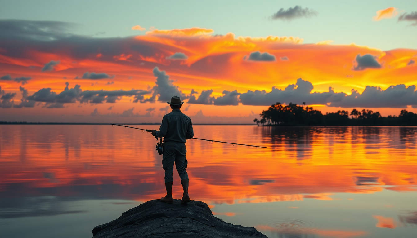 “lone fisherman casting line into glassy Lake George at sunset, mirror-like water reflecting sky